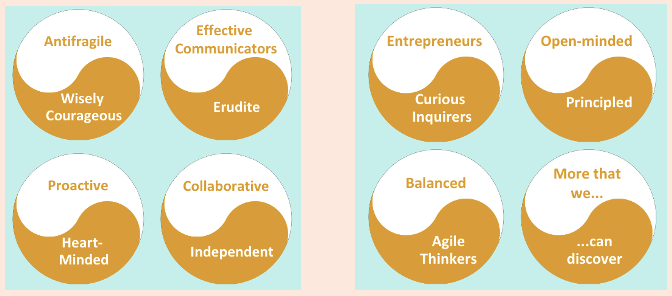 Many of the attributes here do tend act as an umbrella term for two or more deeper but highly associated attributes. They also are highly linked and overlap each other. We have found that they can also be arranged in complimentary pairs e.g., the way that open-mindedness leads to challenging one’s principles or values; and principals are needed to contain and make safe one’s open-mindedness.